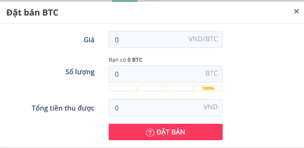 Tiếp tục điền đầy đủ thông tin yêu cầu sau khi đã bấm vào “Mua” hoặc “Bán” để tiến hành giao dịch coin.