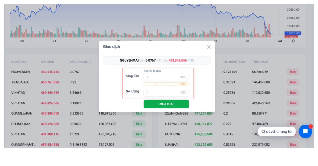 Sau đó, bạn nhấn vào nút “Đặt mua” hoặc “Đặt bán” ở phía dưới danh sách những người mua/ bán coin.