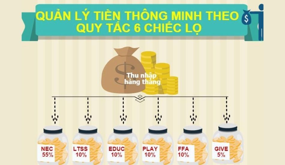 Nguyên tắc 6 cái lọ được sáng tạo bởi Harv Eker sẽ giúp bạn quản lý chi tiêu một cách chi tiết nhất. Phương pháp này sẽ quản lý tổng thu nhập của bạn theo 6 cái lọ với mục đích khác nhau. Bạn cần có kỹ năng lập kế hoạch để phân chia phương pháp hiệu quả. Nếu tổng thu nhập của bạn là 100% thì 6 chiếc lọ sẽ được chia nhỏ với tỷ lệ: