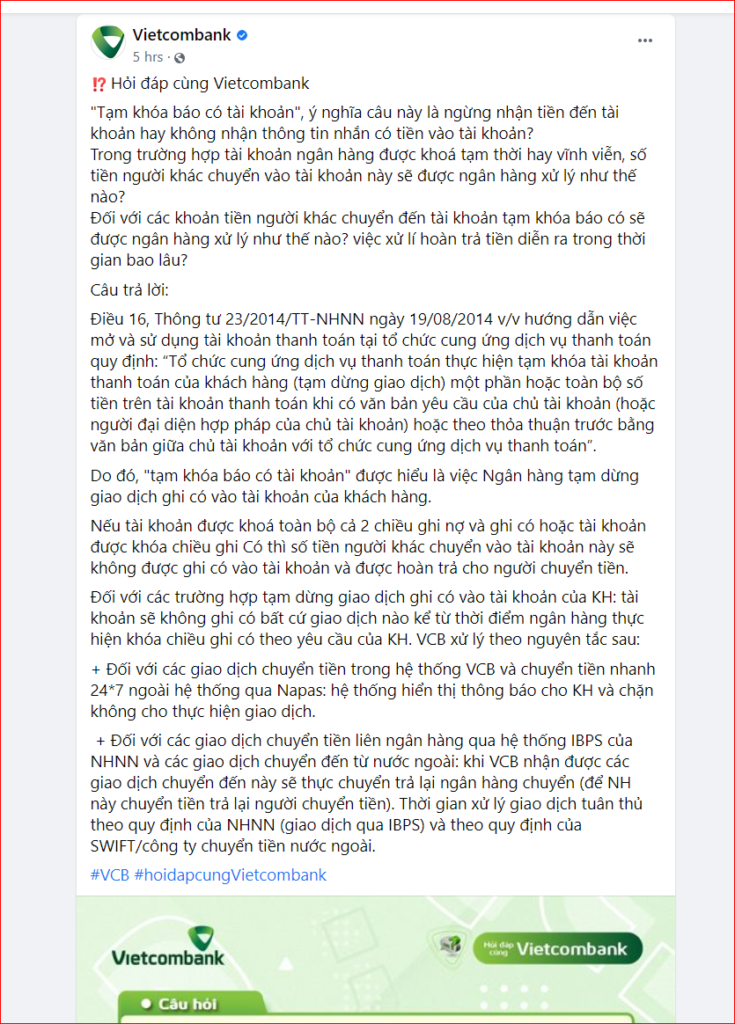 Nếu tài khoản được khoá toàn bộ cả 2 chiều ghi nợ và ghi có hoặc tài khoản được khóa chiều ghi Có thì số tiền người khác chuyển vào tài khoản này sẽ không được ghi có vào tài khoản và được hoàn trả cho người chuyển tiền", Vietcombank làm thông báo trên Fanpage.
