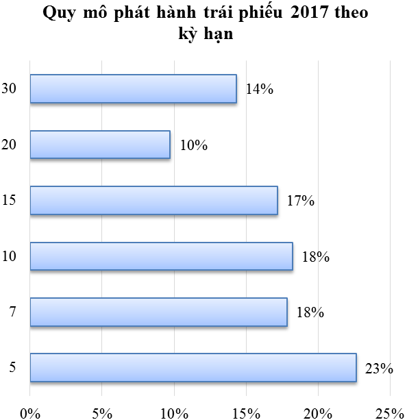 Mặc dù trái phiếu Chính phủ được phát hành với các kỳ hạn từ 2-15 năm, song tỷ lệ trúng thầu cao nhất lại là các trái phiếu có kỳ hạn dưới 5 năm, chiếm khoảng 90% khối lượng phát hành. Điều này cho thấy các nhà đầu tư trên thị trường hiện nay đa số tập trung vào phân khúc trái phiếu kỳ hạn ngắn. Cơ cấu này cho thấy rõ sự phân bố không đồng đều giữa các kỳ hạn. Kỳ hạn niêm yết bình quân kéo dài tới 6,87 năm 2017 cao gấp 1,32 lần so với năm 2016.