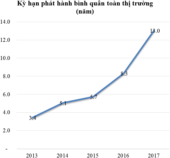 Cơ cấu kỳ hạn trái phiếu Chính phủ phát hành đã có sự cải thiện qua từng năm, phát hành đa dạng hóa kỳ hạn từ dưới 1 năm đến 30 năm. Trước năm 2013, trái phiếu Chính phủ chủ yếu được phát hành ở các kỳ hạn ngắn từ 5 năm trở xuống, sang giai đoạn 2013-2016 việc triển khai phát hành trái phiếu kỳ hạn dài 15 năm, 20 năm và 30 năm đã đáp ứng được tốt hơn nhu cầu của các quỹ đầu tư, các công ty bảo hiểm, giúp kéo dài kỳ hạn vay trung bình của cả danh mục nợ trái phiếu Chính phủ. Theo đó, kỳ hạn phát hành bình quân trái phiếu Chính phủ năm 2015 đạt 6,98 năm tăng 2,14 năm so với mức 4,84 năm của năm 2014, năm 2016 đạt 8,71 năm, năm 2017 đạt kỷ lục 12,74 năm, tăng so với mức 4,1 năm của năm 2011 và tăng 8,83 năm so với mức 3,91 năm của năm 2011.
