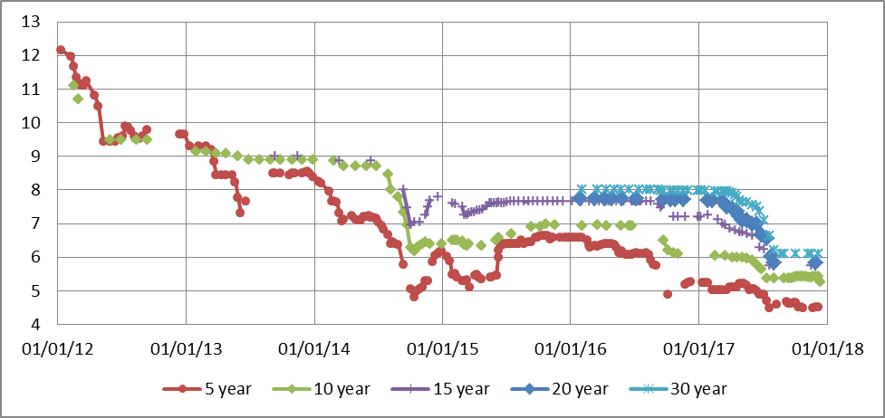 Trong năm 2015, mặt bằng lại suất tiếp tục giảm nhẹ so với năm 2014, trong đó kỳ hạn 10 năm giảm nhiều nhất (113 điểm), kỳ hạn 3 năm có mức giảm ít nhất (21 điểm). Trong năm 2016-2017, lãi suất huy động trái phiếu Chính phủ chủ yếu vẫn là xu hướng giảm đối với tất cả các kỳ hạn. Nếu như trong năm 2016, kỳ hạn 20-30 năm có lãi suất giảm rất ít (2-4 điểm) so với các kỳ hạn khác (kỳ hạn 5 năm giảm 130 điểm), thì sang đến năm 2017, kỳ hạn 20-30 năm lại có mức giảm mạnh nhất (gần 190 điểm). Vì vậy, chênh lệch lãi suất giữa kỳ hạn 10 năm và 30 năm đã giảm từ 188 điểm năm 2016 xuống còn 82 điểm vào năm 2017, phản ánh chính xác hơn kỳ vọng về lãi suất dài hạn trong tương lai. Lãi suất phát hành giảm từ 0,62% đến 1,89% ở tất cả các kỳ hạn, lãi suất phát hành bình quân là 6,07% giảm 0,42% so với mức 6,49% của năm 2016.