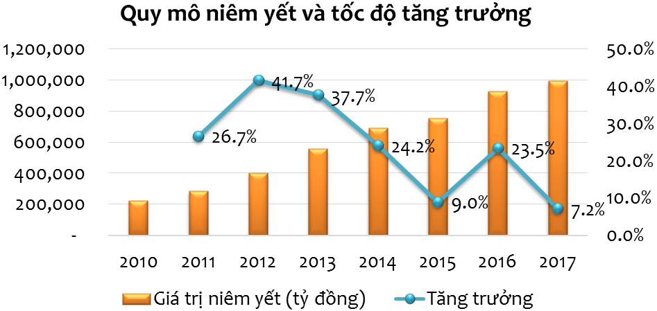 Năm 2016, toàn thị trường có 571 mã trái phiếu niêm yết, tương đương giá trị đạt khoảng gần 997.528 tỷ đồng. Như vậy, so với mức 151.808 tỷ đồng cuối năm 2009, quy mô niêm yết tăng xấp xỉ 6,6 lần. Năm 2017, toàn thị trường có 612 mã trái phiếu niêm yết với giá trị niêm yết đạt 1.015 nghìn tỷ đồng, tăng hơn 8% so với cuối năm 2016 (tương đương 23% GDP). Mặc dù quy mô niêm yết chỉ tăng 8,4% so với năm 2016, nhưng quy mô giao dịch tăng 33%, giá trị giao dịch bình quân đạt trên 8,8 nghìn tỷ đồng/phiên, tăng 39% so với năm 2016. Trong đó, có tới ¼ số phiên có giá trị giao dịch trên 10 nghìn tỷ đồng/phiên, đặc biệt giao dịch Repo tăng 74,1% so với 2016, chiếm 48,5% tổng giá trị giao dịch thị trường. Như vậy, thị trường trái phiếu Chính phủ tiếp tục có bước phát triển mạnh về chiều sâu, tiến thêm một bước về chất lượng của thị trường. Về cơ cấu hàng hóa giao dịch, nhờ kỳ hạn bình quân danh mục trái phiếu Chính phủ được kéo dài, tỷ trọng giao dịch trái phiếu Chính phủ kỳ hạn dài trên 5 năm cũng tăng lên 20% từ mức 15% năm 2016. Một điểm sáng nữa trên thị trường thứ cấp là NĐTNN đã mua ròng đến hơn 18,5 nghìn tỷ đồng trái phiếu Chính phủ năm 2017. Con số này gấp khoảng hơn 1,6 lần so với giá trị mua ròng trong cả năm 2016.