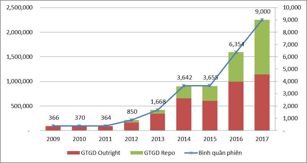 Kết quả giao dịch: Quy mô giao dịch trên thị trường tăng trưởng mạnh mẽ qua các năm, năm 2017 tổng giá trị giao dịch đạt 2.249.964 tỷ đồng, tăng 24,6 lần so với cuối năm 2009. Giá trị giao dịch bình quân phiên tăng từ mức 366 tỷ/phiên năm 2009, 1.000-1.200 tỷ đồng/phiên năm 2012, lên mức 1,668 tỷ/phiên năm 2013, đạt 3,642 tỷ/phiên trong năm 2014, và lên mức 9.214 tỷ đồng/phiên năm 2017, bằng 0,67% dư nợ trái phiếu Chính phủ, tăng 40% so với năm 2016 và gần gấp đôi so với mức thanh khoản trên toàn thị trường cổ phiếu. Giá trị vốn hoá thị trường đạt 997,5 nghìn tỷ đồng, tương đương 22% GDP và tăng 7,2% so với năm 2016. Thị trường đạt giá trị giao dịch cao với 50/250 phiên (20%) có giá trị giao dịch trên 10.000 tỷ đồng/phiên, trong đó có phiên giao dịch kỷ lục đạt trên 16.000 tỷ đồng/phiên vào ngày 26/9/2017.