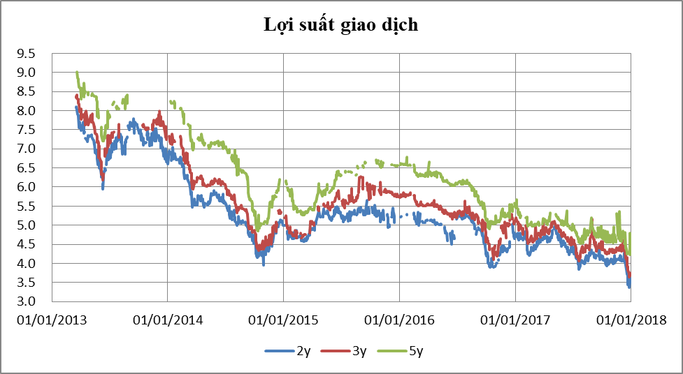 Lợi suất giao dịch trên thị trường thứ cấp cho thấy kể từ năm 2012 đến năm 2014, lãi suất nhìn chung có xu hướng giảm. Lãi suất trái phiếu kho bạc Nhà nước kỳ hạn 5 năm giảm mạnh từ mức 9% kể từ đầu năm 2013 xuống mức thấp 4.8% vào năm 2014. Trong năm 2015, lợi suất giao dịch có xu hướng tăng, các kỳ hạn 2 năm, 3 năm và 5 năm tăng từ 30-50 điểm cơ bản so với đầu năm 2015. Tuy nhiên, xu hướng giảm lãi suất lại tiếp tục trong các năm 2016-2017. Trong đó, năm 2017 có mức giảm mạnh hơn năm 2016. Đến năm 2017, lợi suất giao dịch đang ở mức thấp nhất kể từ năm 2017 trở lại đây. Lợi suất giao dịch kỳ hạn 2 năm, 3 năm và 5 năm đang dừng ở mức 3,36%, 3,64% và 4,22%.